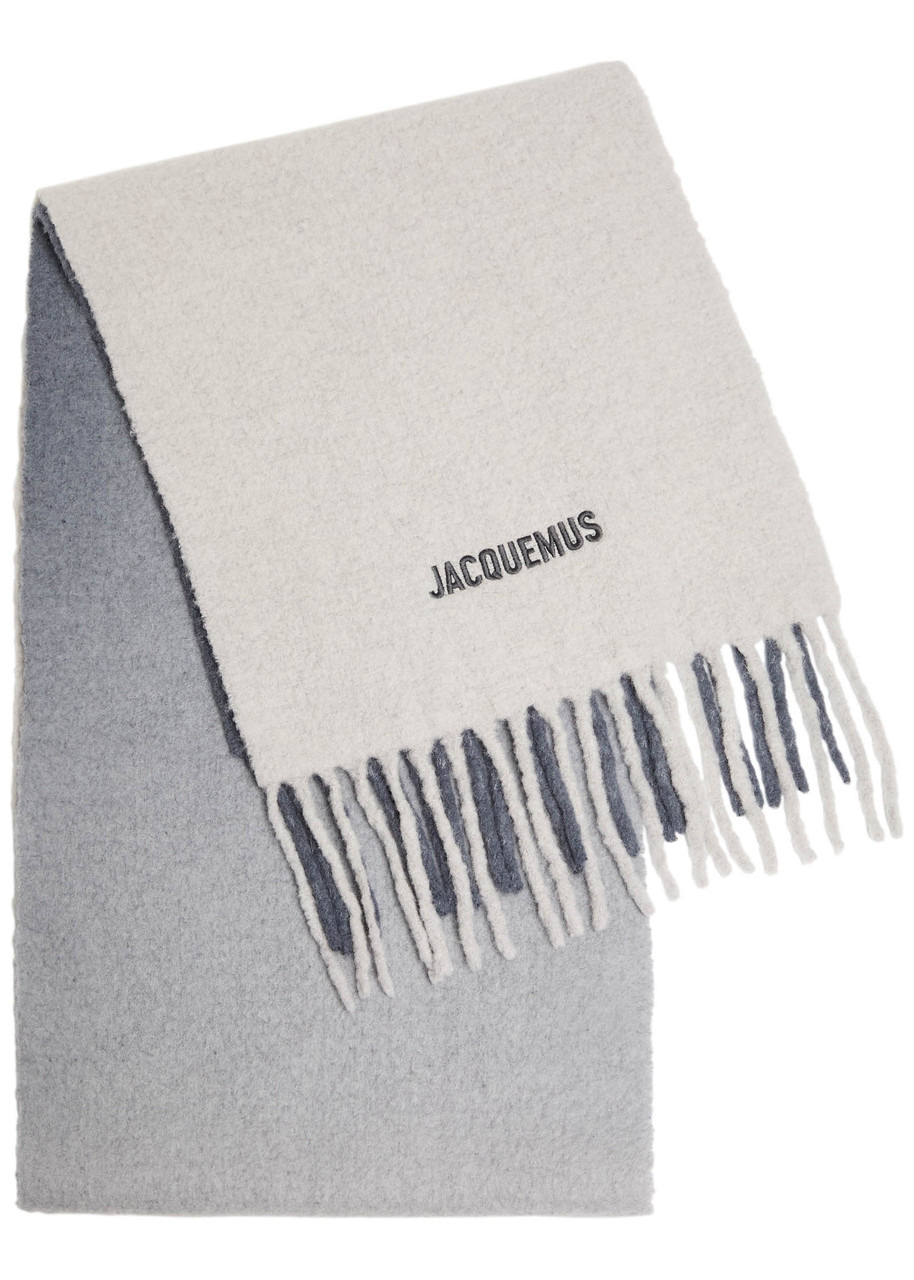 Info & Care Jacquemus alpaca-blend scarf Degrade, logo embroidery, fringed trims; 80%;alpaca, 20% nylon Dry clean Size & Fit Width: 15.5 inches/ 39cm Length: 91 inches/ 230cm