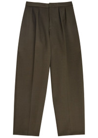 Info & Care Jacquemus woven trousers Concealed drawstring at waist, pleats, side slip pockets, pressed crease through legs, two button-fastening back pockets Concealed hook and button fastenings at front Fabric 1: 53% polyester, 42% virgin wool, 5% elastane; fabric 2: 95% virgin wool, 5% elastane Dry clean Size & Fit Internal leg length: 32 inches/ 81.5cm Midweight Straight-leg cut Tailored style Model is 6'1"/ 185cm and wears a size;IT48