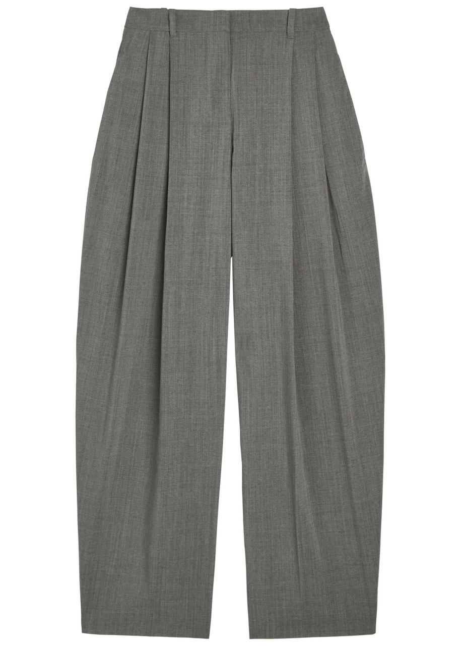 Info & Care Jacquemus wool trousers Melange, belt loops, pleats at waist,;side slip pockets,;pressed crease through legs,;slit pockets at back; Concealed button, hook and zip fastenings at front; 100% wool; Dry clean Coordinating items available ; Size & Fit Inside leg length: 32.5 inches/ 83cm Midweight Barrel-leg cut, high-rise fit Model is 5'9"/ 175cm and wears a size;FR36