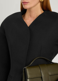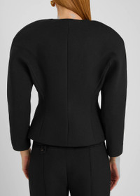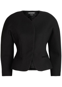 Info & Care Jacquemus knit jacket V-neck, padded shoulders, dolman puff sleeves, darts through waist, slit pockets at front, notched front hem, fully lined; Concealed press-stud fastenings through front 100% polyester; lining: 52% viscose, 48% cotton Dry clean Size & Fit Length shoulder to hem: 21 inches/ 53.5cm Midweight Fitted at the waist, flared hem Model is 5'9"/ 175cm and wears a size;FR36