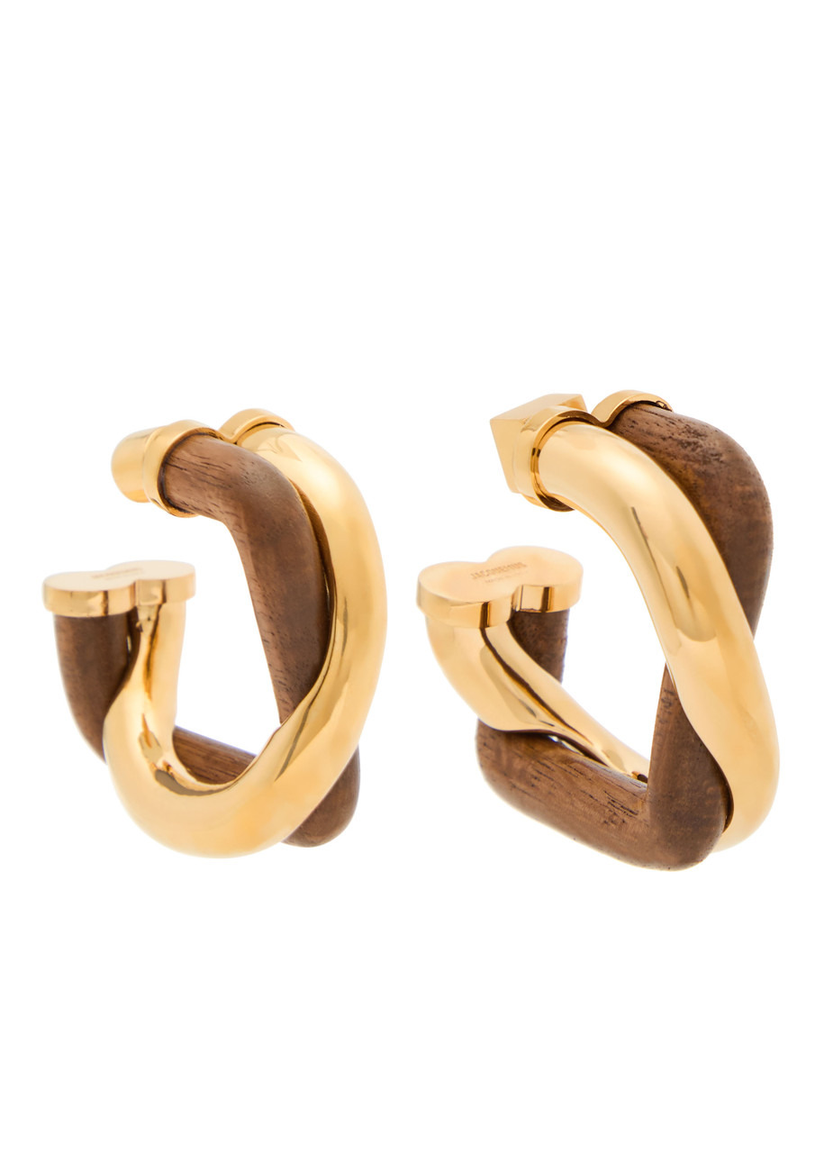 Info & Care Jacquemus brass and wood hoop;earrings Two-tone, intertwined design, designer engraved Geometric post fastening for pierced ears Presented in a designer-stamped box with a pouch Please note, we are unable to refund or exchange for pierced earrings; Size & Fit Drop: 4.1cm