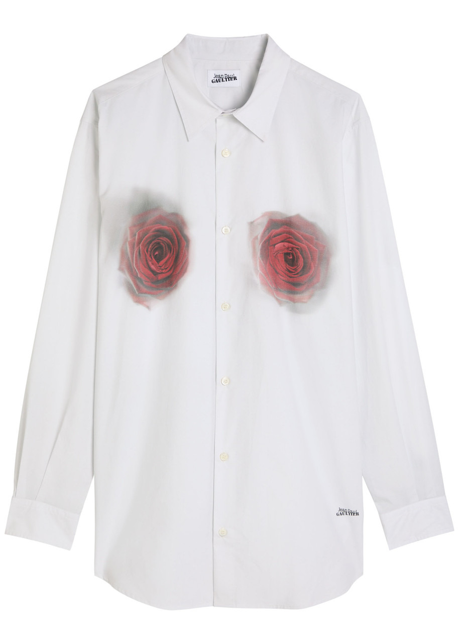 Info & Care Jean Paul Gaultier cotton-poplin shirt Floral print at front, button-fastening cuffs, logo print, box pleat at back, curved hem Button fastenings through front 100% cotton Hand wash Size & Fit Length shoulder to hem: 35 inches/ 89cm Midweight Designed to be worn oversized Model is 5'8"/ 173cm and wears a size small;