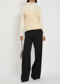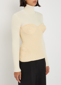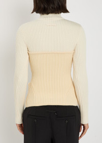 Info & Care Jean Paul Gaultier;wool-blend;top Layered effect, ribbed, high-neck, padded cups Slips on; 96% virgin wool, 4% polyamide Hand wash; Size & Fit Length shoulder to hem: 23 inches/ 58.5cm Midweight Slim fit, tapered waist; Model is 5'9"/ 175cm and wears a size small