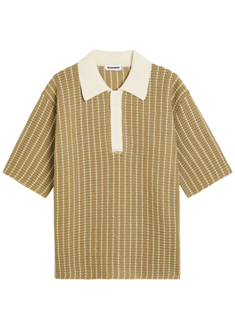 Info & Care Jil Sander cotton-knit polo shirt Striped, concealed zip-fastening neck with contrasting ribbed trim Slips on 100% cotton Dry clean Size & Fit Length shoulder to hem: 27 inches/ 68.5cm Midweight Relaxed boxy fit Model is 6'1"/ 185cm, chest size 38 inches and wears a size;IT48