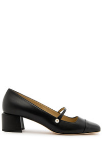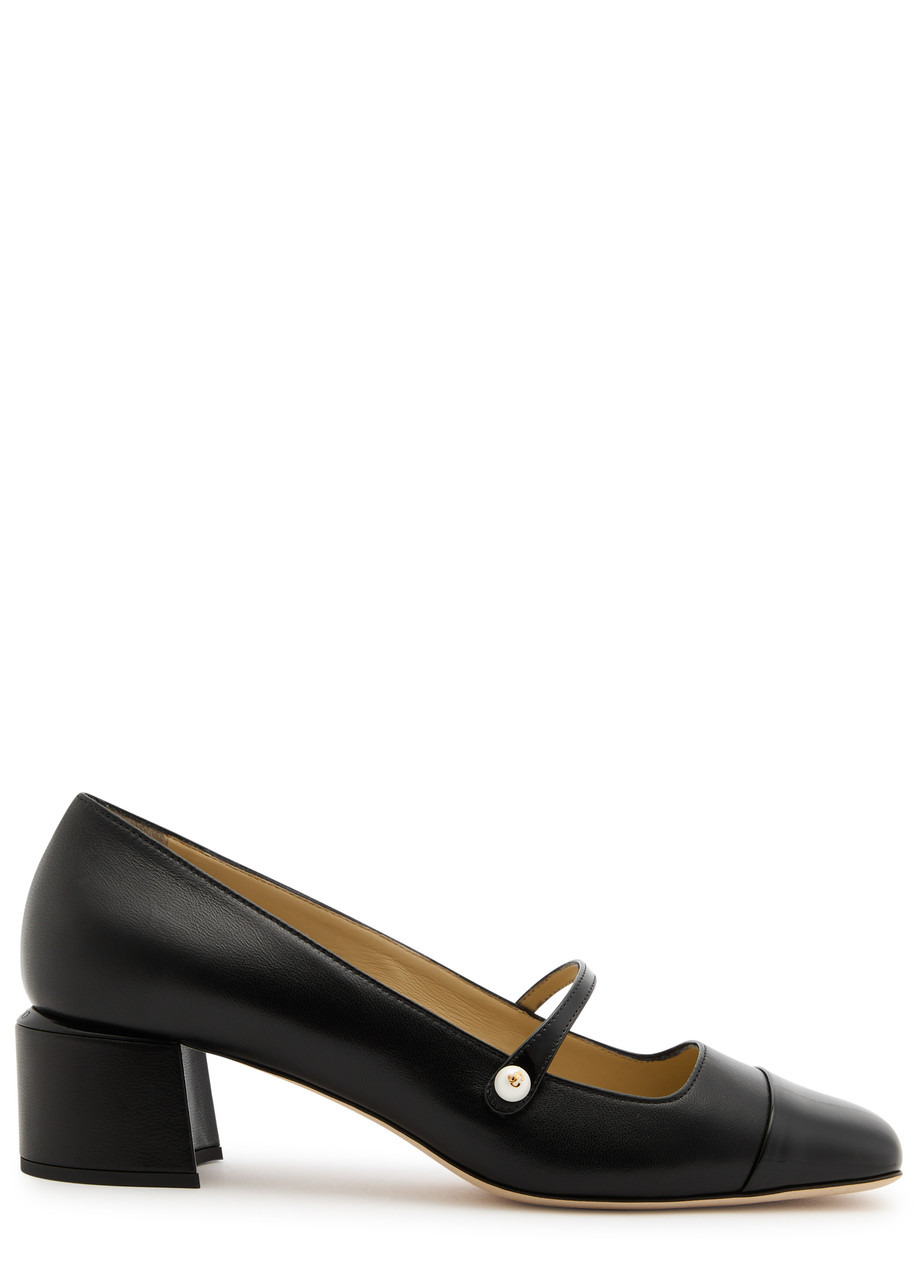 Info & Care Jimmy Choo leather pumps Block heel measures approximately 2 inches/ 45mm Patent leather toe cap and strap, logo-embellished pearl at strap, square toe Slip-on Size & Fit Only available in full sizes, go up to the nearest whole size if you take a half size