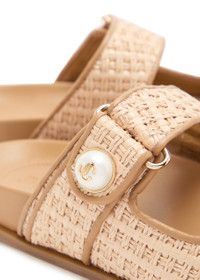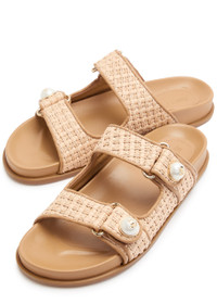 Info & Care Jimmy Choo raffia sliders Metallic weave, designer plaque at pearl embellishment, contoured footbed, open round-toe Slip-on Size & Fit Only available in full sizes, go up to the nearest whole size if you take a half size