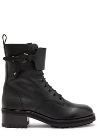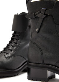 Info & Care Jimmy Choo grained leather ankle boots Block heel;measures approximately 2 inches/ 50mm Strap with logo detail, heel tab, gripped rubber sole, round toe; Lace-up front and zip fastening at side; Size & Fit Only available in full sizes, go up to the nearest whole size if you take a half size;