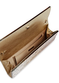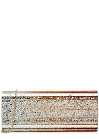 Info & Care Jimmy Choo acrylic clutch; Detachable chain shoulder strap, glittered, designer engraved, grained metallic leather side panels, internal patch pocket, fully lined Concealed magnetic press-stud fastening at flap front; Size & Fit Width: 9.5 inches/ 24cm Height: 4 inches/ 10cm Depth: 1.5 inches/ 4cm; Shoulder strap drop: 18 inches/ 46cm
