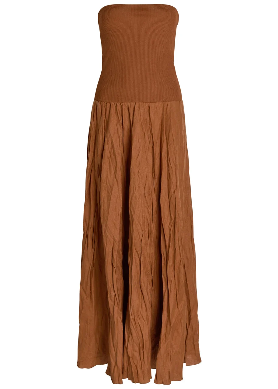 Info & Care Johanna Ortiz linen-blend;dress Can be styled in multiple ways Strapless, ribbed bodice, crinkled finish Slips on 60%;linen, 35% polyamide, 5% elastane Dry clean Size & Fit Length shoulder to hem: 50 inches/ 127cm Midweight Slim bodice, relaxed skirt Model is 5'9"/ 175cm and wears a size US4