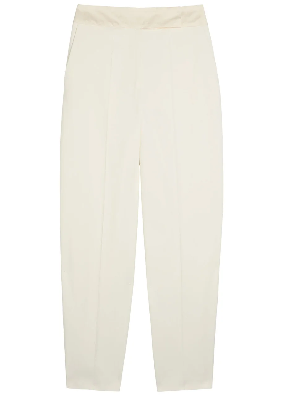 Info & Care Joseph stretch-crepe;trousers Ribbed waistband,;side slip pockets, pressed crease through legs, back slit pockets Partially concealed button fastenings at front Fabric 1: 98% viscose, 2% elastane; fabric 2: 100% polyester Dry clean Size & Fit Inside leg length: 32 inches/ 81cm Midweight Tapered-leg cut Designed to sit high on the waist Model is 5'10"/ 178cm and wears a size;FR36