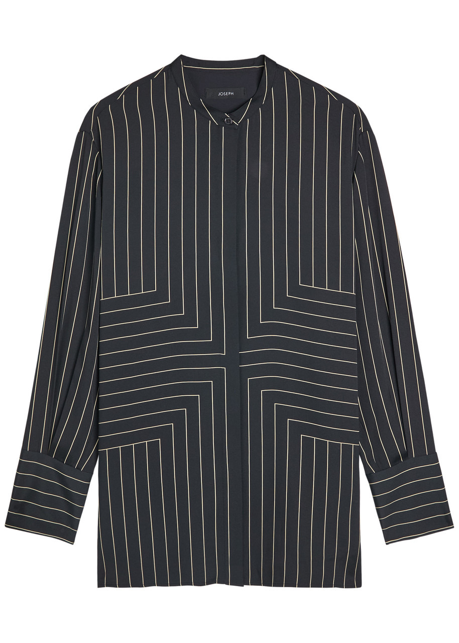 Info & Care Joseph;silk-blend;blouse Geometric striped print, button-fastening cuffs with inverted pleat, side splits Concealed button fastenings through front 50%;silk, 41% viscose, 9% elastane Dry clean Coordinating items available Size & Fit Length shoulder to hem: 29 inches/ 73.5cm Midweight Loose fit Model is 5'8"/ 173cm and wears a size;FR36