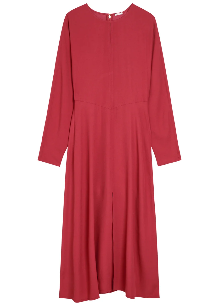 Info & Care Joseph crepe dress Round-neck, dolman sleeves, keyhole at bust, front hem split; Concealed zip fastening at back 63% viscose, 37% acetate Dry clean Size & Fit Length shoulder to hem: 50 inches/ 127cm Midweight Loose style, slightly fitted at the waist Soft A-line cut Model is 5'8"/ 173cm and wears a size;FR36