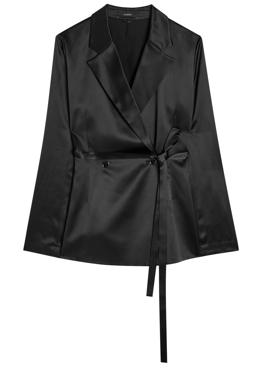 Info & Care Joseph silk;blazer Notched lapels, belt loops, tie-fastening belt; Double-breasted button fastenings through front 100% silk Dry clean Co-ordinating items available Size & Fit Length shoulder to hem: 27 inches/ 68.5cm Midweight Relaxed fit, use belt to cinch the waist Model is 5'10"/ 178cm and wears a size FR36