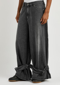 Info & Care JW Anderson denim jeans; Mid-rise fit, oversized wide-leg cut, dropped crotch, belt loops, five pockets, contrast stitching, designer plaque at back, designer engraved hardware, belt loops with buckle fastening belt at cuffs, faded finish; Partially concealed button and zip fastenings at front; 100% cotton; Machine wash cold inside out to avoid colour transfer; Size & Fit Front rise: 14 inches/ 35.5cm Inside leg length: 26 inches/ 66cm Midweight; Model is 6'1"/ 185cm and wears a size;W32