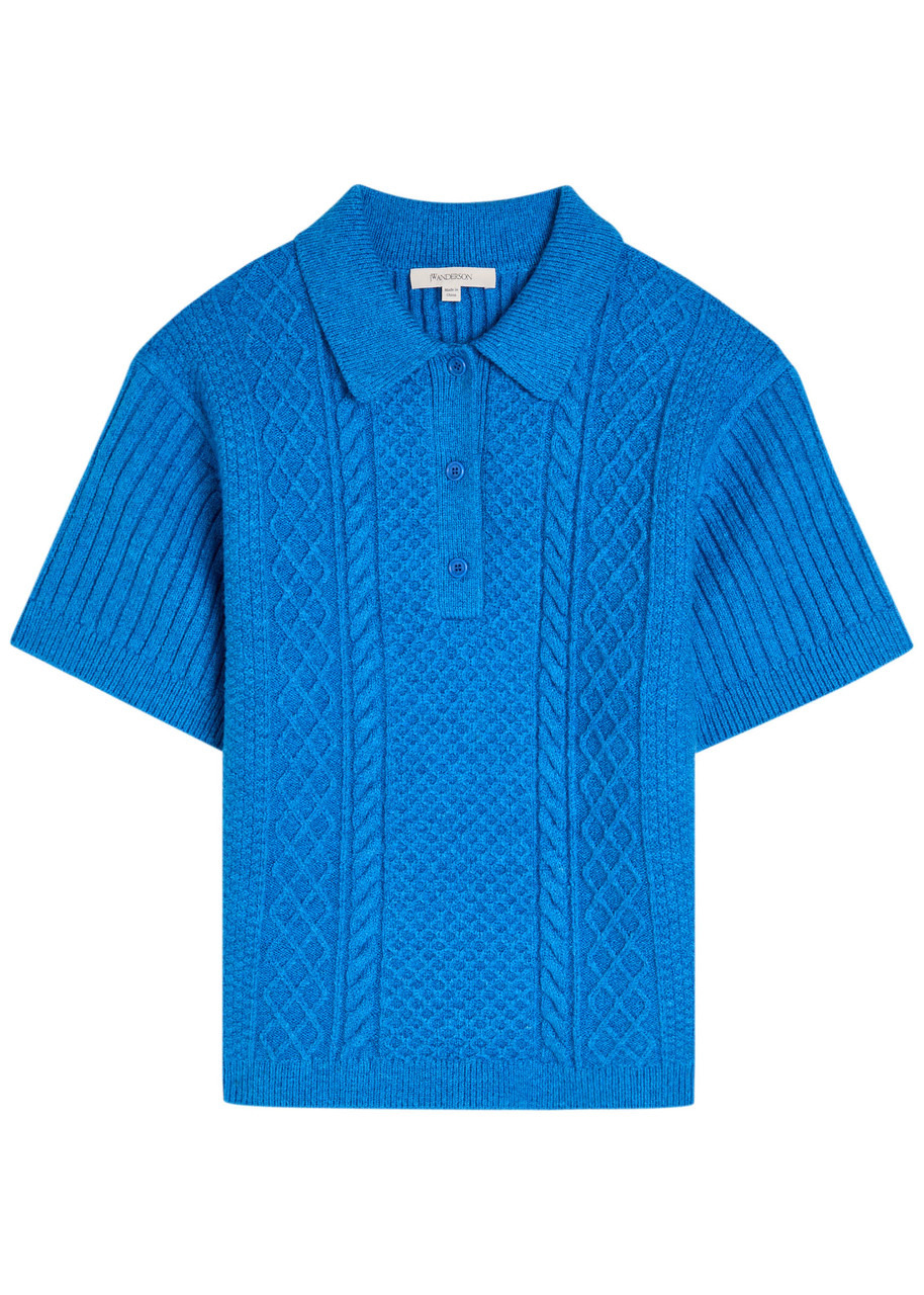 Info & Care JW Anderson knit polo shirt; Cable knit front, button-fastening neck, ribbed sleeves, designer plaque at back neck, ribbed back and trims Slips on; 27% sheep wool, 27% cotton, 26% polyamide, 17% polyester, 3% elastane Dry clean Coordinating items available Size & Fit Length shoulder to hem: 20 inches/ 51cm Midweight Relaxed, boxy fit Model is 5'9"/ 175cm and wears a size small