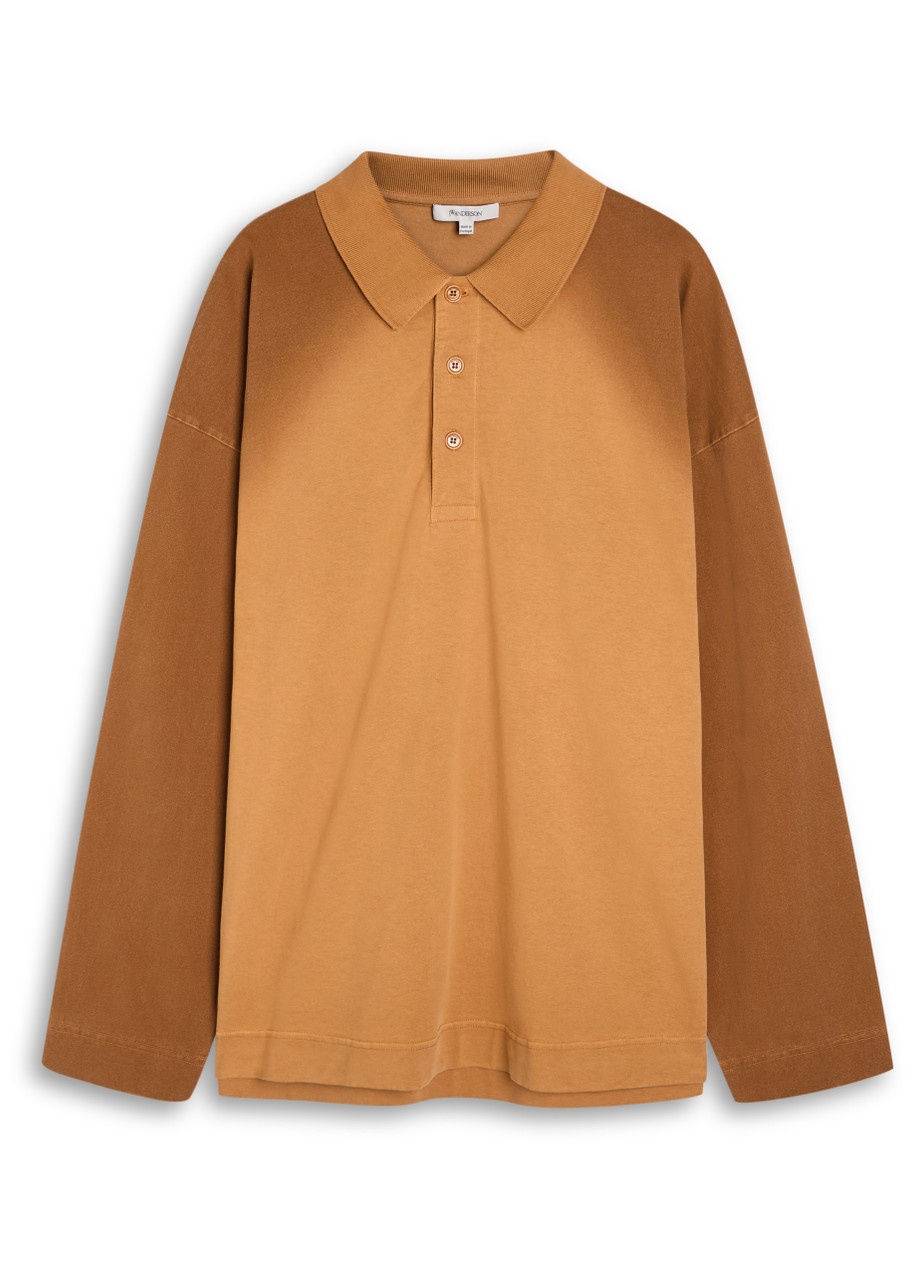 Info & Care JW Anderson cotton polo;shirt Button-fastening neck, ribbed collar, dropped shoulders, faded logo at front, side splits at hem Slips on 100% cotton Machine wash Size & Fit Length shoulder to hem: 29.5 inches/ 75cm Midweight Relaxed fit Model is 6'1"/ 185cm, chest size 40 inches and wears a size medium