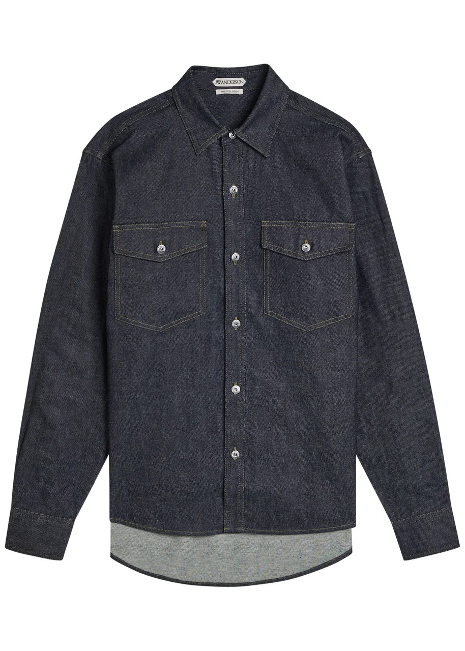 Info & Care JW Anderson denim shirt; Button-fastening cuffs, button-fastening chest flap pockets, designer plaque at back, wide box pleat at back, longer curved back hem Button fastening through front; 100% cotton; Dry clean; Size & Fit Length shoulder to hem: 26.5 inches/ 68cm; back: 32 inches/ 82cm; Midweight Relaxed fit Model is 5'10"/ 178cm and wears a size small