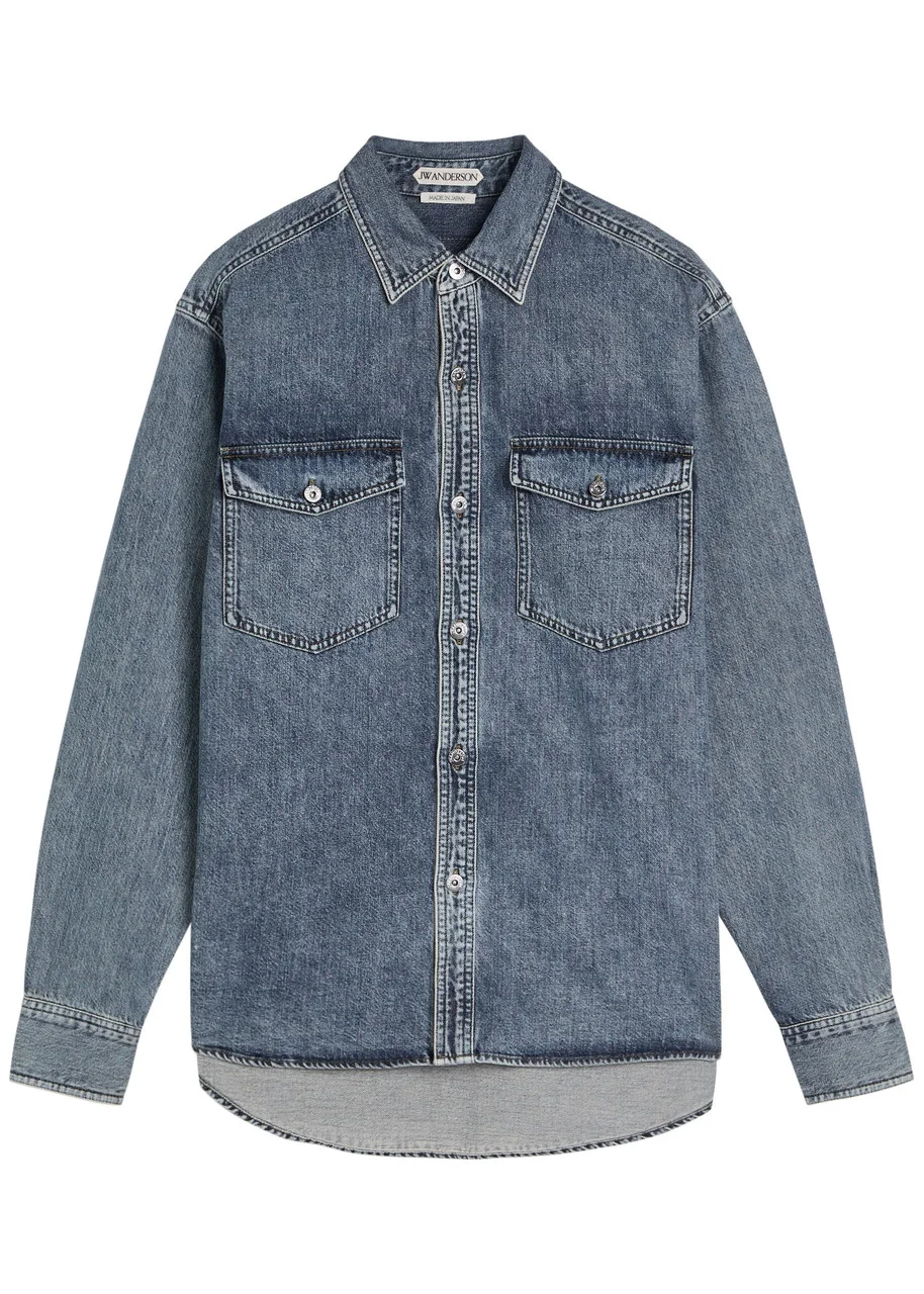 Info & Care JW Anderson denim shirt Button-fastening cuffs, button-fastening front pockets, wide box pleat at back, leather designer plaque at back neck, longer curved back hem, washed finish Button fastenings through front 100% cotton Machine wash cold inside out to avoid colour transfer Size & Fit Length shoulder to hem: front: 27 inches/ 68.5cm; back: 30 inches/ 76cm Midweight Relaxed;fit Model is 5'10"/ 178cm and wears a size small
