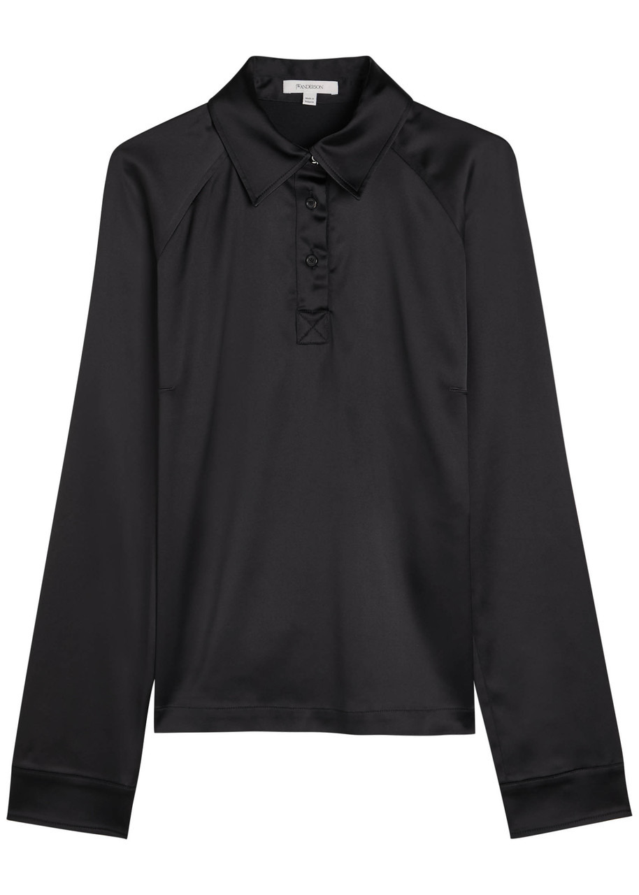 Info & Care JW Anderson stretch-satin polo top Button-fastening neck, raglan sleeves, button-fastening cuffs, darts at bust, side splits; Slips on 75% acetate, 22% polyamide, 3% elastane Dry clean; Size & Fit Length shoulder to hem: 23.5 inches/ 59.5cm Midweight Slightly relaxed fit Model is 5'9"/ 175cm and wears a size;UK8