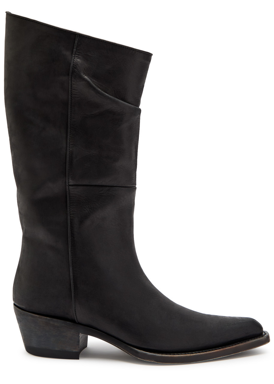 Info & Care KHAITE leather mid-calf boots Block heel measures approximately 1.5 inches/ 35mm Gathered effect, pointed square-toe, slightly distressed and worn finish Pull on Size & Fit Only available in full sizes, go up to the nearest whole size if you take a half size