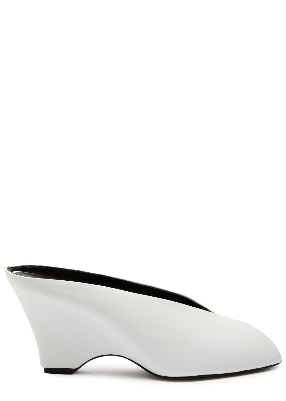 Info & Care KHAITE leather;mules Sculpted wedge heel meausre approximately 3 inches/ 75mm Low V-cut vamp, open round peep toe Slip-on Size & Fit Only available in full sizes, go up to the nearest whole size if you take a half size;