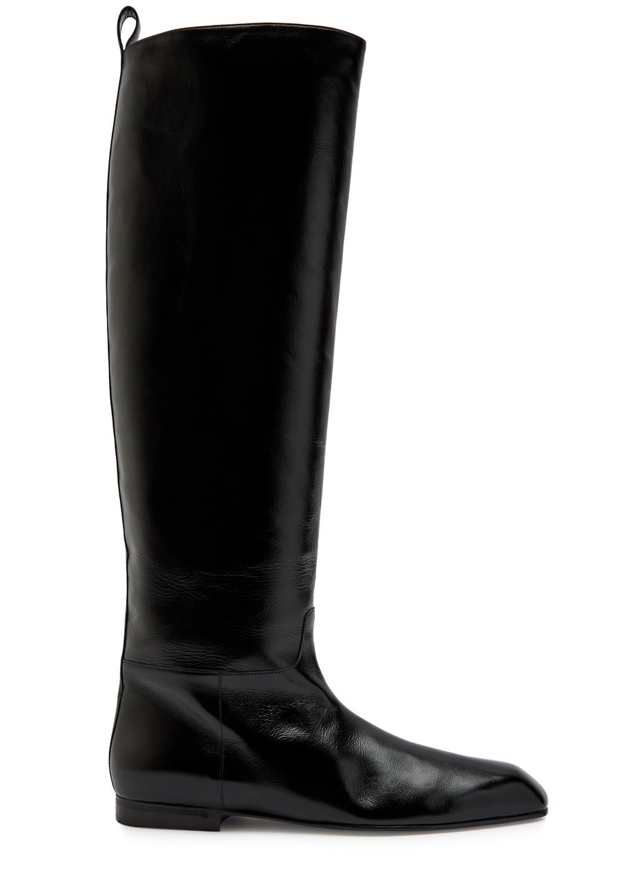 Info & Care KHAITE glossed leather knee-high boots Heel tab at top, pointed square-toe Pull-on Size & Fit Only available in full sizes, go up to the nearest whole size if you take a half size