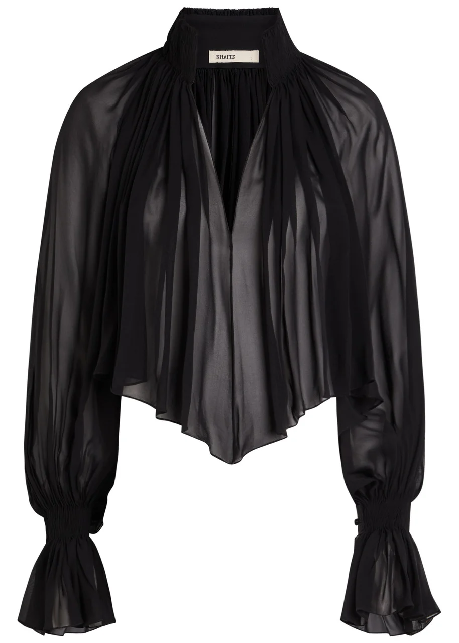 Info & Care KHAITE semi sheer silk-chiffon blouse Pleated, hook-fastening smocked high-neck, balloon sleeves, button-fastening cuffs Slips on 100% silk Dry clean Size & Fit Length shoulder to hem: 20 inches/ 51cm Midweight Loose fit Model is 5'8"/ 173cm and wears a size small