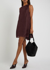 Info & Care KHAITE suede tote; Shoulder strap, cut-out sides, designer stamp, leather lining T-bar fastening at open top; Size & Fit Width: 1: 16 inches/ 41cm; 2: 9 inches/ 23cm Height: 10 inches/ 26cm Depth: 7 inches/ 18cm Shoulder strap drop: 9 inches/ 23cm