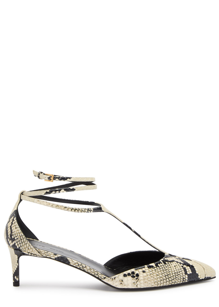 Info & Care Khaite leather pumps; Heel measures approximately 2 inches/ 45mm; Python print, python-effect, T-bar strap, pointed toe; Wrap-around buckle-fastening ankle strap; Size & Fit Only available in full sizes, go up to the nearest whole size if you take a half size;