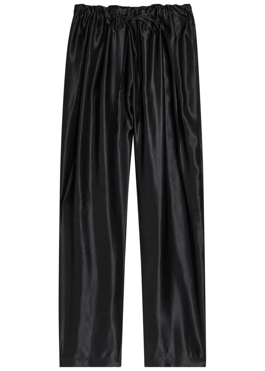 Info & Care KHAITE satin trousers Elasticated drawstring waist, back slit pocket Pull on 59% viscose, 41% cupro; lining: 100% silk Dry clean Size & Fit Inside leg length: 32 inches/ 81cm Midweight Relaxed fit, straight-leg cut Model is 5'10"/ 178cm and wears a size small