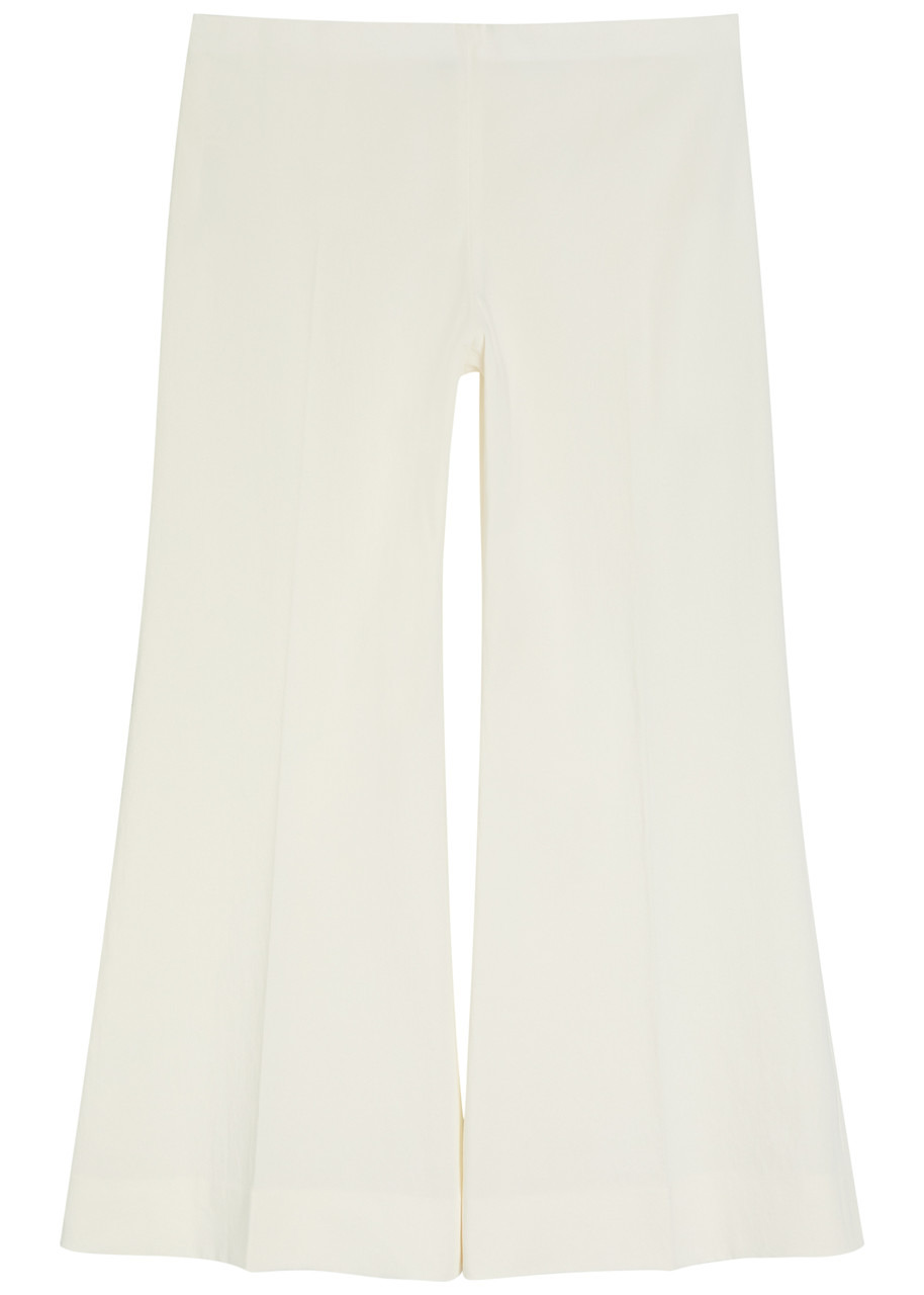 Info & Care Khaite cotton trousers Pressed crease through legs Concealed zip fastening at side 100% cotton Dry clean Size & Fit Inside leg length:;26 inches/ 66cm Midweight Flared-leg cut, cropped Model is 5'10"/ 178cm and wears a size;US4