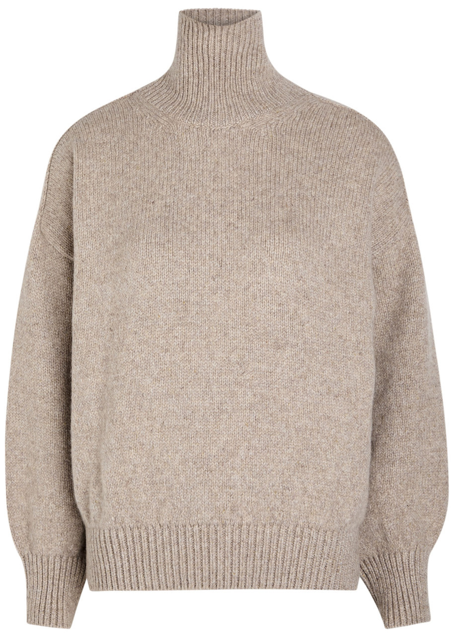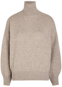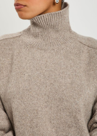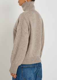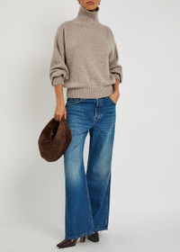Info & Care KHAITE cashmere jumper Ribbed, high-neck, dropped shoulders Slips on 100% cashmere Dry clean Size & Fit Length shoulder to hem: 24 inches/ 61cm Midweight Relaxed fit Model is 5'10"/ 178cm and wears a size small