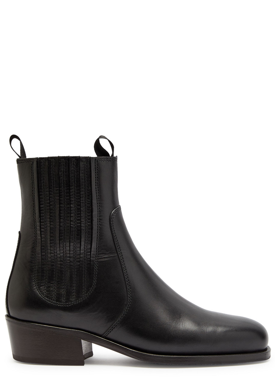 Info & Care Lemaire leather Chelsea boots Heel tab, elasticated ribbed inserts at sides, stacked wooden heel, round toe Pull-on; Size & Fit Only available in full sizes, go up to the nearest whole size if you take a half size