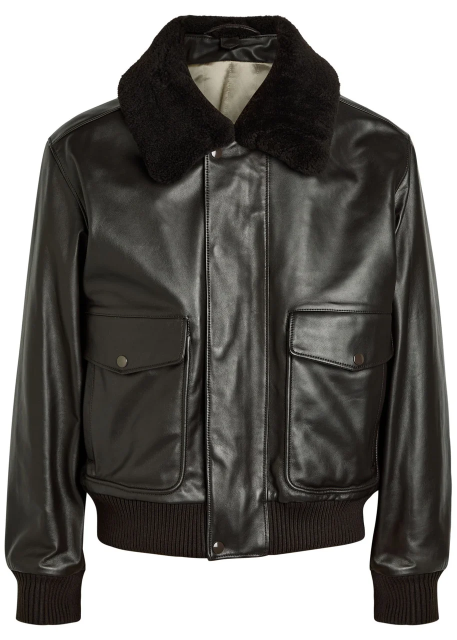 Info & Care Lemaire leather jacket Quilted, detachable shearling collar, press-stud fastening front flap pockets, side slip pockets, wide box pleat at back, rib-knit trims, two internal patch pockets, fully lined Concealed two-way zip and press-stud fastenings through front 100% calf leather; lining: 52% cotton, 48% polyester; 60% silk, 40% polylactide; Specialist clean Size & Fit Length shoulder to hem: 24 inches/ 61cm Midweight Relaxed fit, boxy style Model is 6'1"/ 185cm, chest size 38 inches and wears a size;large