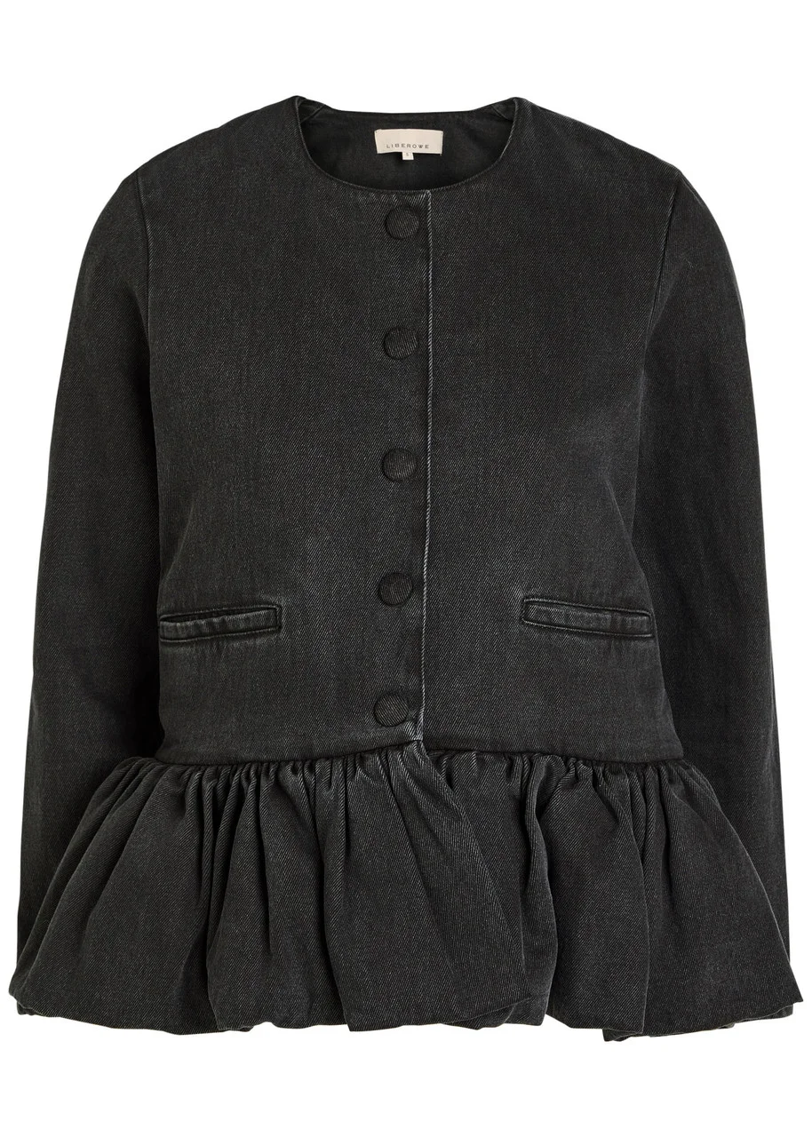Info & Care Liberowe denim;jacket Round-neck, front slit pockets, pleats at peplum balloon hem, faded finish Press-stud fastenings through front 100% cotton Dry clean Size & Fit Length shoulder to hem: 24 inches/ 61cm Midweight Regular fit, boxy style Model is 5'10"/ 178cm and wears a size small