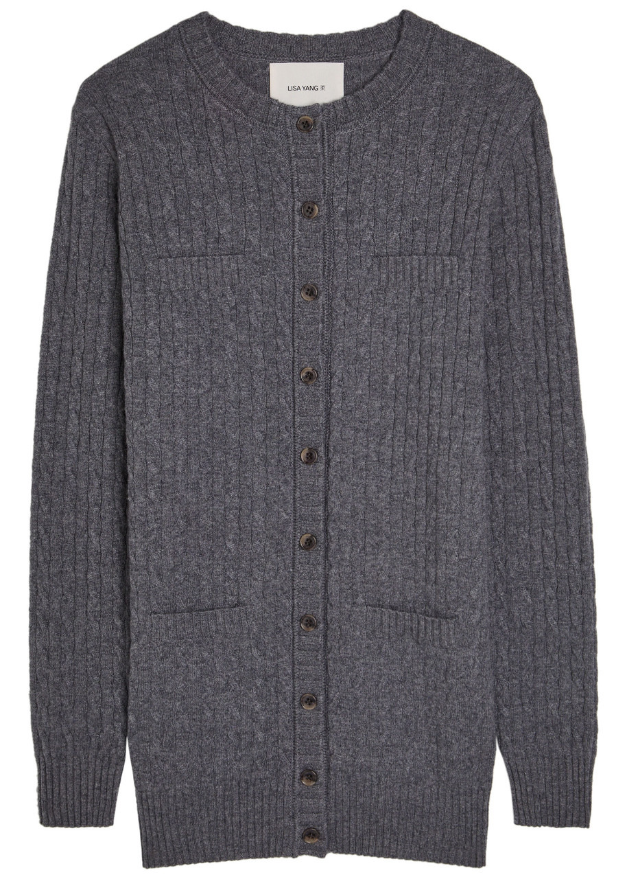 Info & Care Lisa Yang cashmere cardigan Cable-knit, round-neck, four faux pockets at front, ribbed trims Button fastenings through front 100% cashmere Hand wash Size & Fit Length shoulder to hem: 28 inches/ 71cm Midweight Regular fit Model is 5'10"/ 178cm and wears a size 1