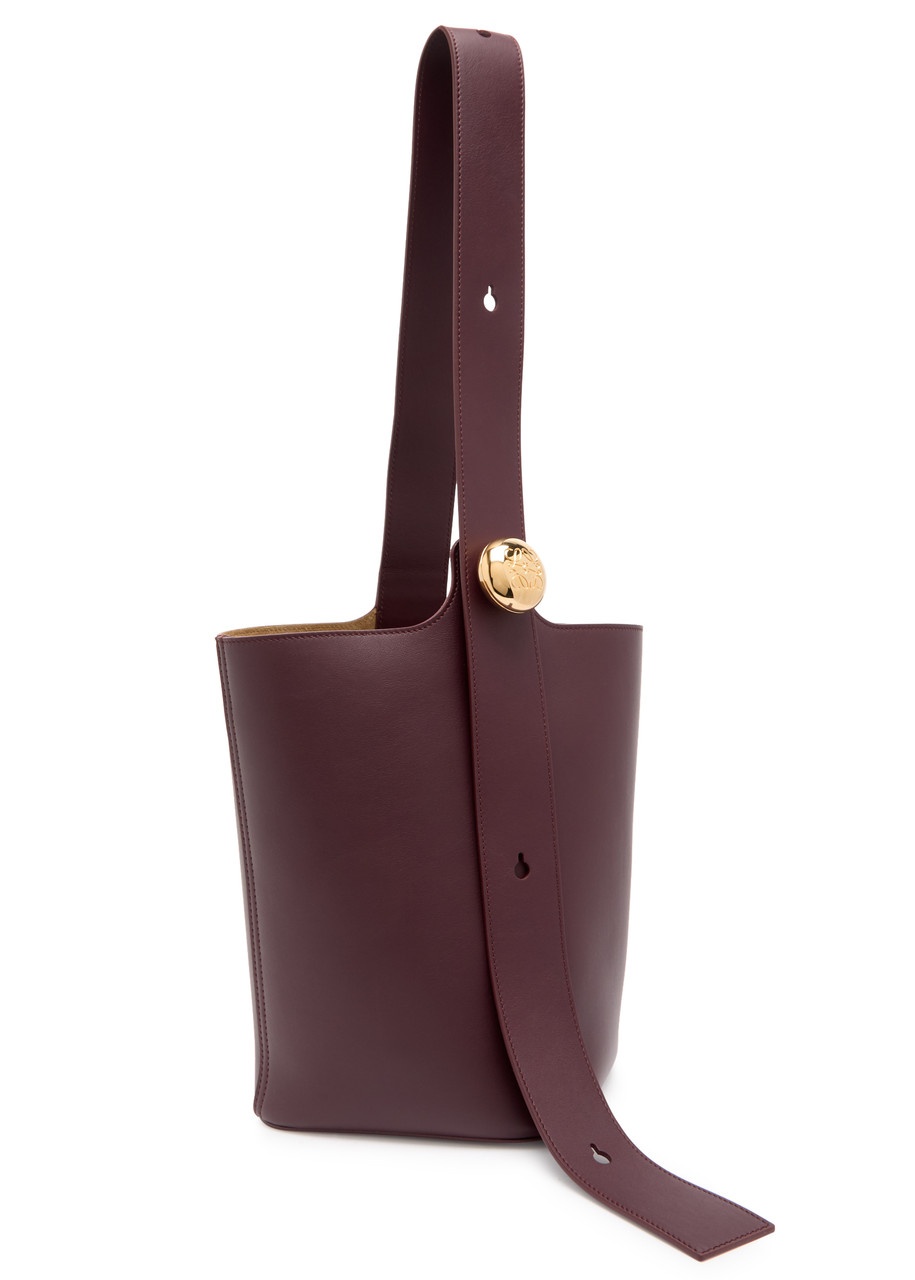 Info & Care Loewe leather bucket bag; Adjustable turn-lock shoulder strap, designer-engraved fastening at shoulder strap, internal patch pocket, suede lining; Open top; Size & Fit Width: 7.5 inches/ 19cm; Height: 11 inches/ 28cm; Depth: 7.5 inches/ 19cm; Min. shoulder strap drop: 7.5 inches/ 19cm; Max. shoulder strap drop: 20 inches/ 51cm;