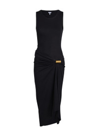 Info & Care Loewe stretch-cotton dress Ribbed, round-neck, gathered and draped details, detachable logo-engraved metal embellishment, asymmetric hem Slips on 97% cotton 3% elastane Machine wash Size & Fit Length shoulder to hem: 1: 43 inches/ 109.5cm; 2: 53 inches/ 134.5cm Midweight Slim fit Model is 5'9"/ 175cm and wears a size small