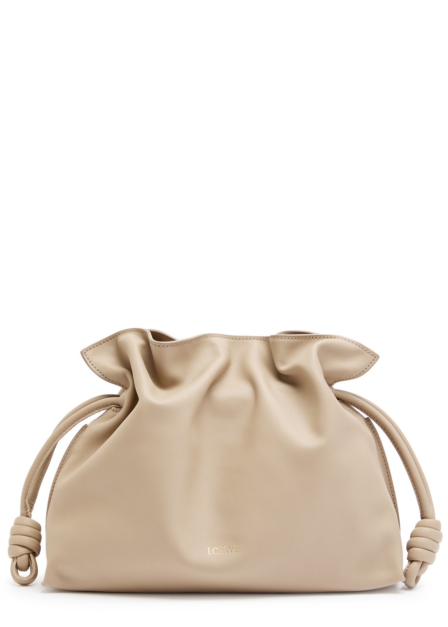 Info & Care Loewe leather clutch Detachable adjustable shoulder strap, knotted drawstrings at sides, metallic designer stamp, suede lining Concealed magnetic fastening at top Size & Fit Width: 11 inches/ 28cm Height: 9 inches/ 23cm Depth: 4 inches/ 10cm Min. shoulder strap drop: 21 inches/ 54cm Max. shoulder strap drop: 23 inches/ 58.5cm