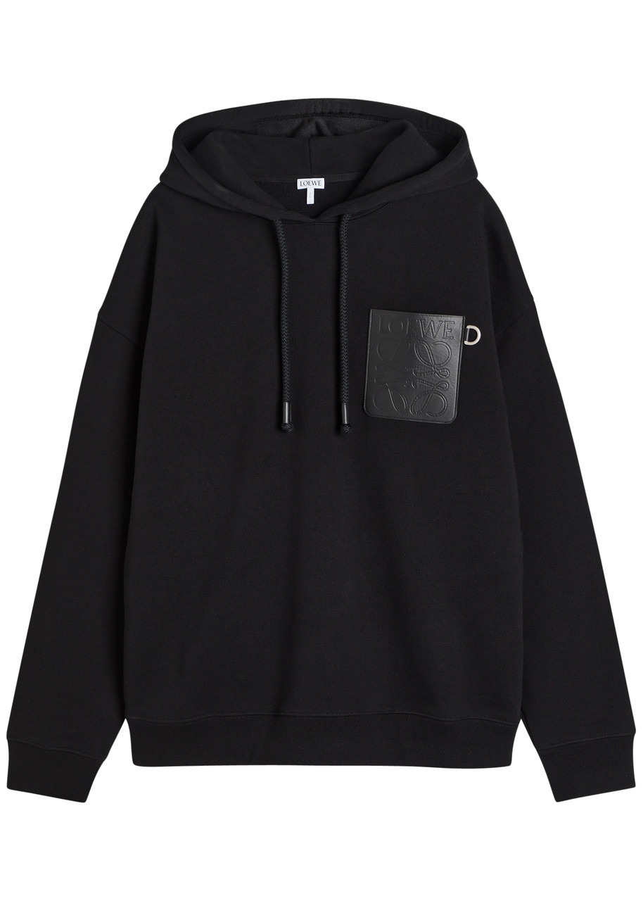 Info & Care Loewe cotton sweatshirt; Drawstring hood, dropped shoulders, logo-debossed leather patch pocket, metal D-ring embellishment, ribbed trims; Slips on 100% cotton; Dry clean Size & Fit Length shoulder to hem: 27 inches/ 68.5cm Heavyweight Relaxed fit Model is 6'1"/ 185cm, chest size 38.5 inches and wears a size medium