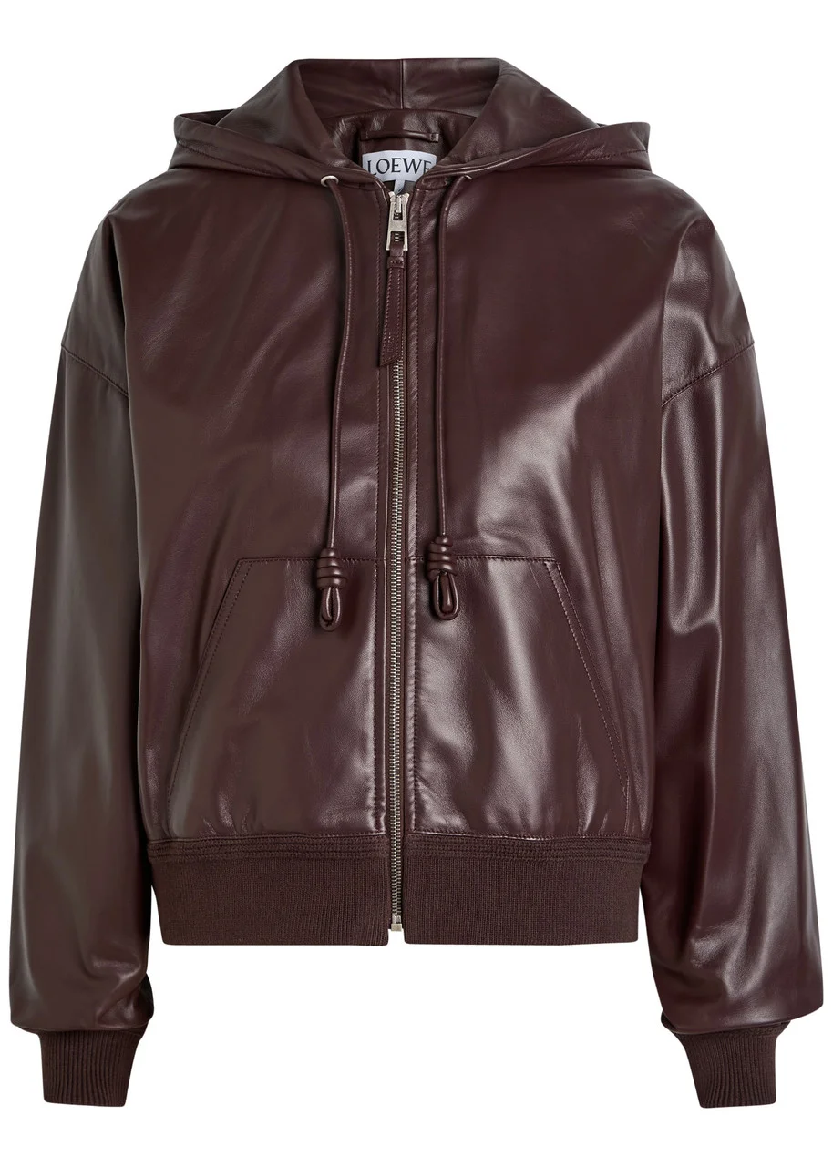 Info & Care Loewe leather jacket Drawstring hood with designer plaque, dropped shoulders, front patch pockets, ribbed trims, internal slip pocket, fully lined Zip fastening through front; 100% lamb leather; rib: 94% cotton, 5% polyamide, 1% elastane; lining: 100% viscose Specialist clean Size & Fit Length shoulder to hem: 21 inches/ 53.5cm Midweight Relaxed fit, boxy style Model is 5'10"/ 178cm and wears a size;FR36
