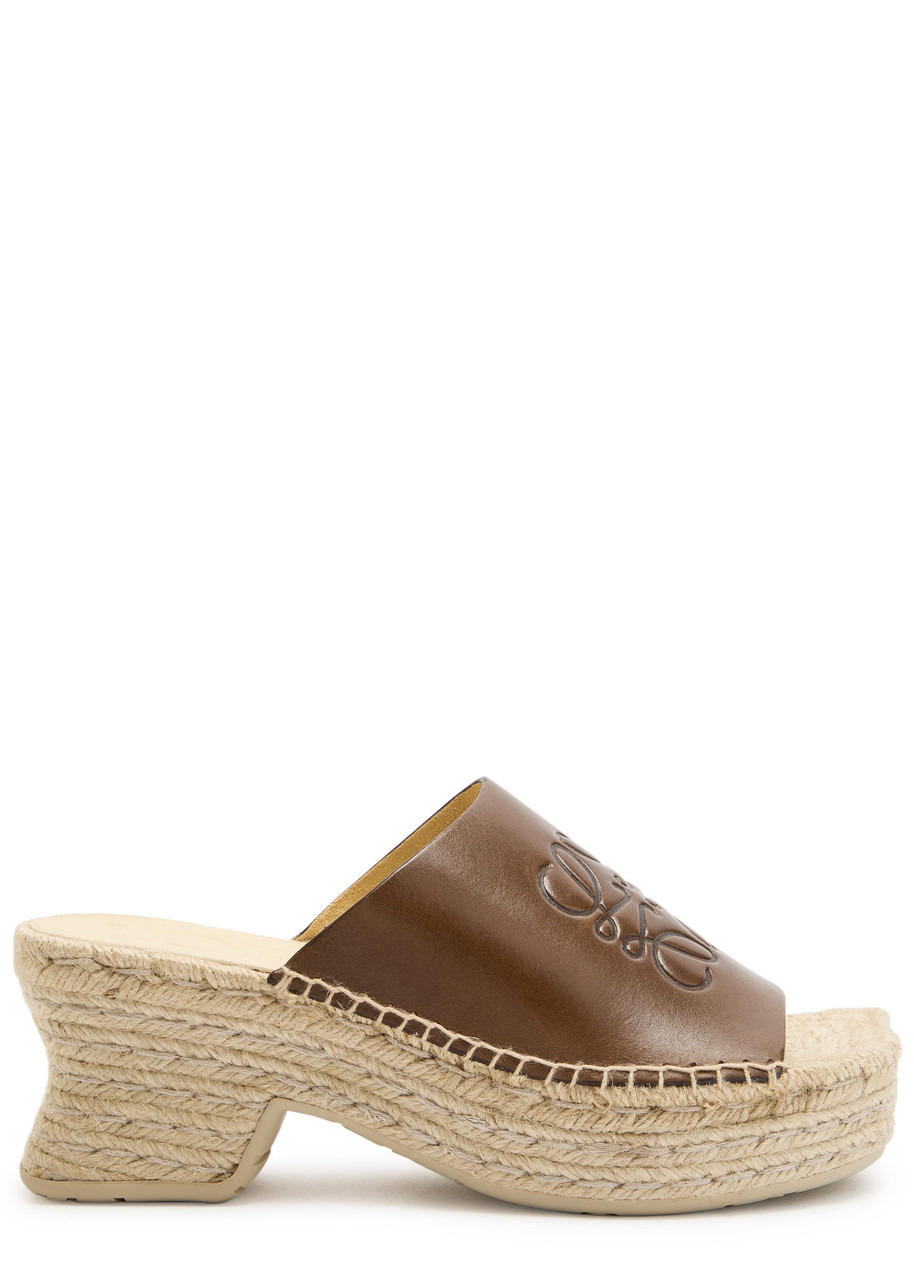 Info & Care Loewe leather espadrilles Espadrille wedge heel measures approximately 3 inches/ 80mm with a 1.5 inch/ 40mm platform Debossed-logo strap, open toe, rubber sole Slips on Size & Fit Only available in full sizes, go up to the nearest whole size if you take a half size