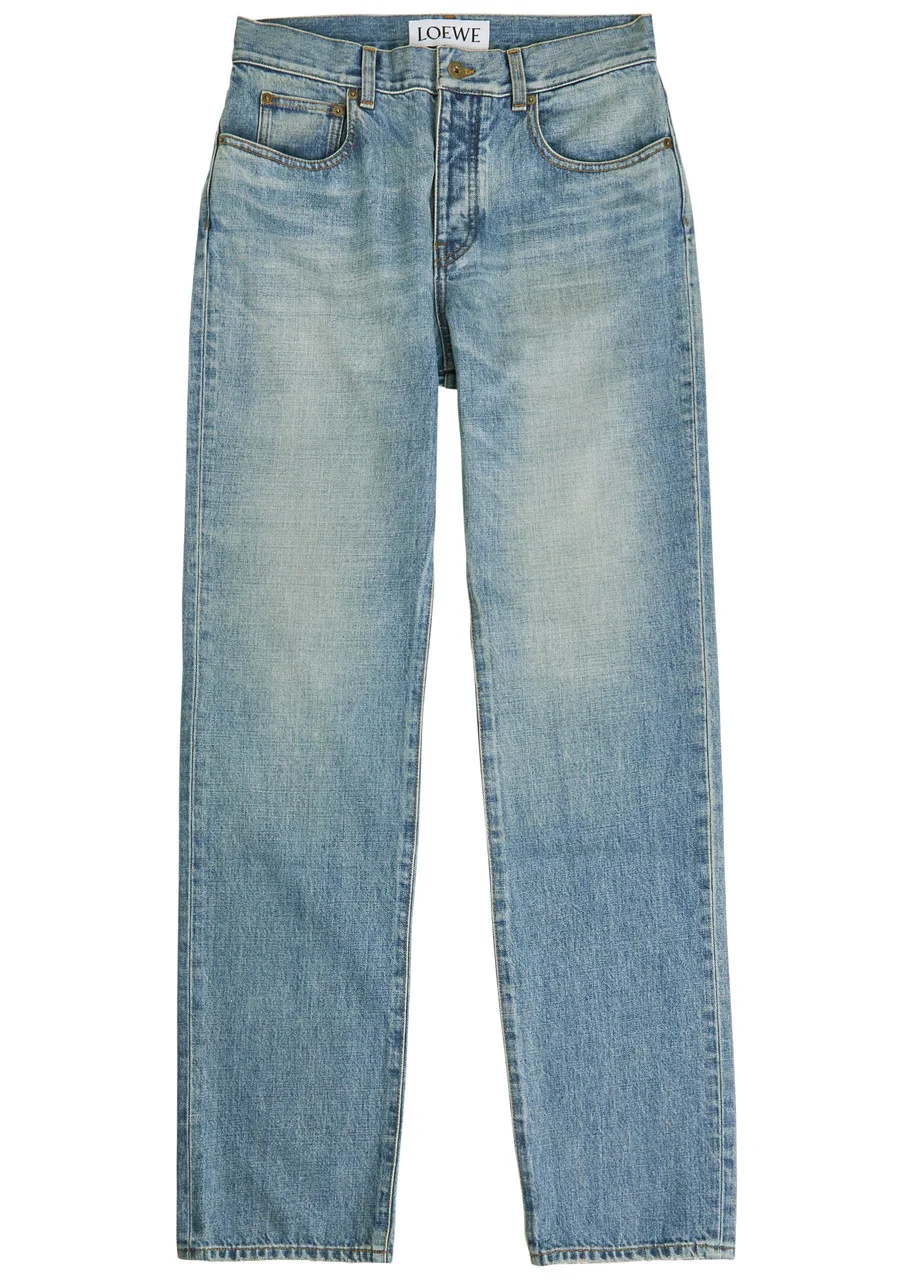 Info & Care Loewe denim jeans Mid-rise fit, slim-leg cut, five pockets, leather designer plaque at back, washed finish Partially concealed button fastenings through front 100% cotton Machine wash cold inside out to avoid colour transfer Size & Fit Front rise: 12 inches/ 30.5cm Inside leg length: 33.5 inches/ 85cm Midweight Model is 6'1"/ 185cm and wears a size;IT48