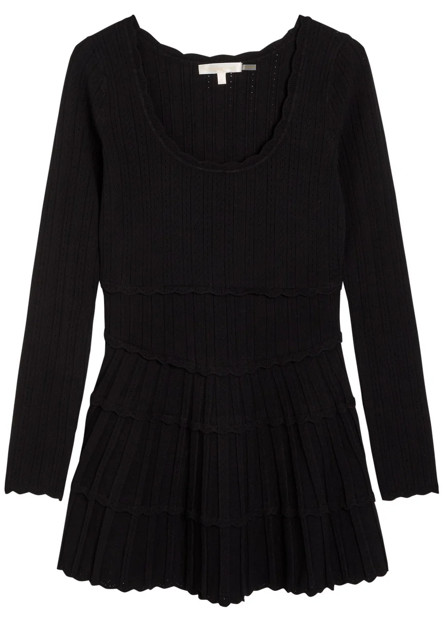 Info & Care Love Shack Fancy knit dress Pointelle, ribbed, scoop-neck, tiered skirt, scalloped trims Slips on 63% viscose, 35% polyester, 2% elastane Dry clean Size & Fit Length shoulder to hem: 30 inches/ 76cm Midweight Slim bodice, flared skirt from the hips Model is 5'9"/ 178cm and wears a size small