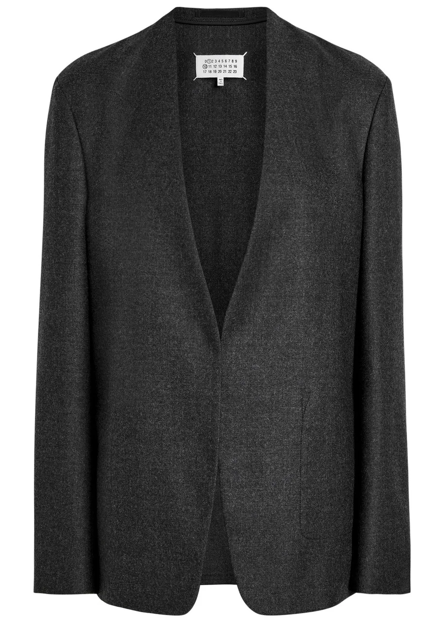 Info & Care Maison Margiela wool blazer Collarless, two internal slip pockets, lined sleeves Slips on 100% virgin wool Dry clean Size & Fit Length shoulder to hem: 28.5 inches/ 72.5cm Midweight Relaxed fit, slimmer across the shoulders Model is 5'9"/ 175cm and wears a size IT40