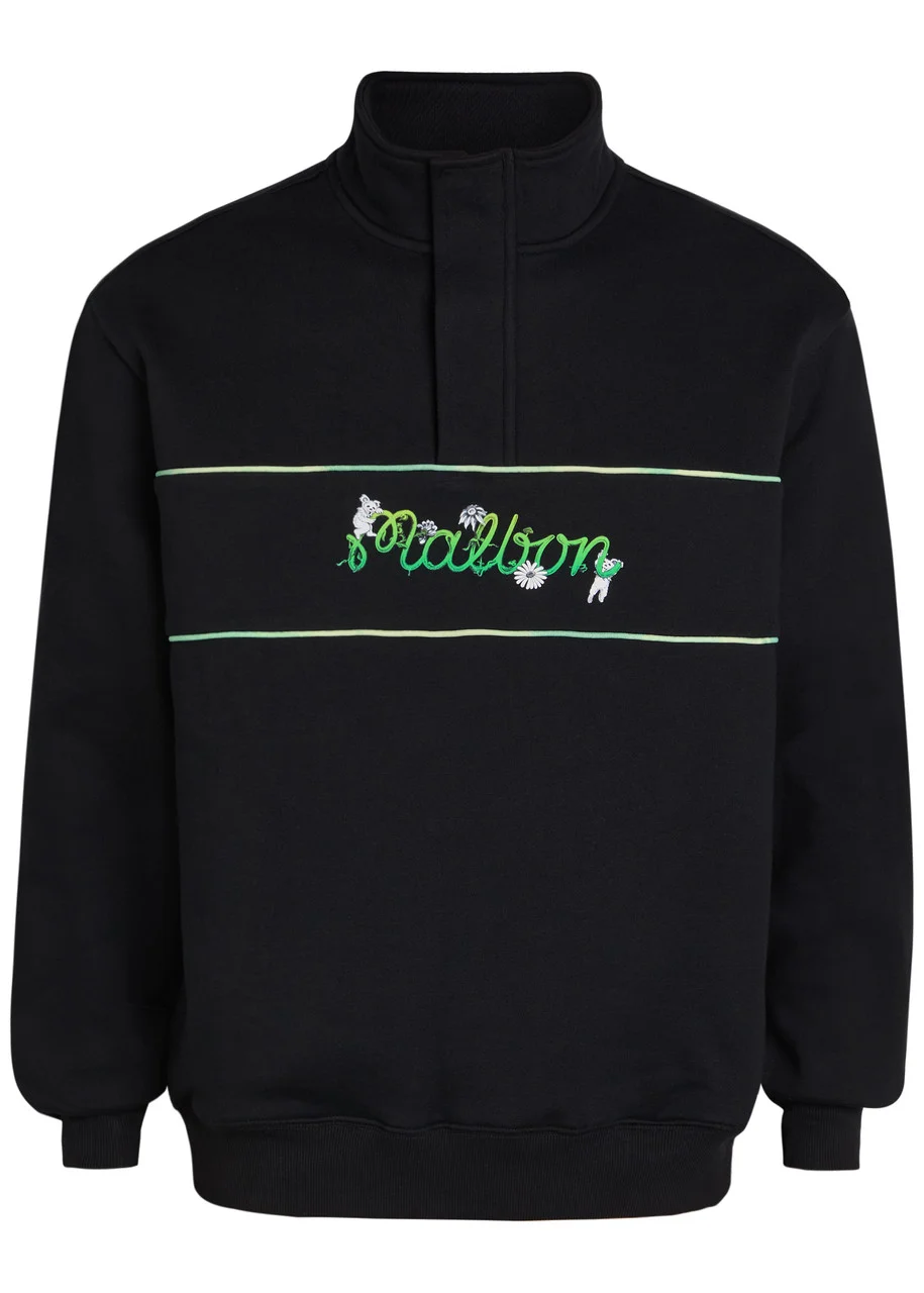 Info & Care Malbon cotton sweatshirt Concealed press-stud and zip-fastening high-neck, embroidered designer applique at cuff, designer print at front and back, zip-fastening side pockets, contrasting piped details, ribbed trims Slips on 100% cotton Machine wash Size & Fit Length shoulder to hem: 26 inches/ 66cm Midweight Relaxed fit Model is 6'2"/ 188cm, chest size 38 inches and wears a size medium