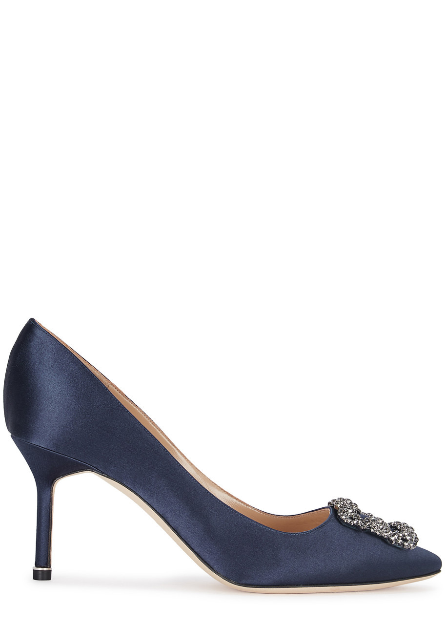 INFO & CARE - Handmade - Manolo Blahnik navy silk satin pumps - Heel measures approximately 3 inches/ 75mm - Crystal-embellished pointed toe - Slip on - Comes with a dust bag SIZE & FIT - Narrow across the toe