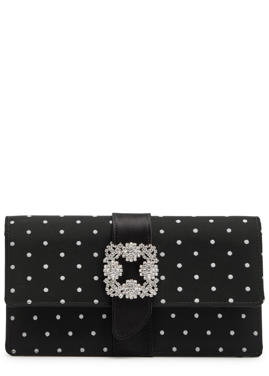 Info & Care Monolo Blanik satin clutch Detachable chain shoulder strap, flocked polka dot design, mesh overlay at front and back, crystal-embellished plaque, internal slip pocket, fully lined Concealed magnetic press-stud fastening at flap front Size & Fit Width: 8.5 inches/ 21.5cm Height: 5.5 inches/ 14cm Depth: 2.5 inches/ 6.5cm Shoulder strap drop: 20 inches/ 51cm