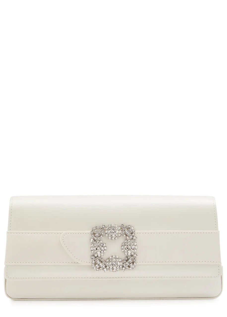 Info & Care Handmade Manolo Blahnik ;satin clutch; Detachable chain shoulder strap, crystal-embellished plaque, internal slip pocket, internal zip-fastening pocket, fully lined Concealed magnetic press-stud fastening at flap front; Size & Fit Width: 9.5 inches/ 24cm; Height: 4.5 inches/ 11.5cm; Depth: 1.25 inches/ 3cm; Shoulder strap drop: 6 inches/ 15cm;