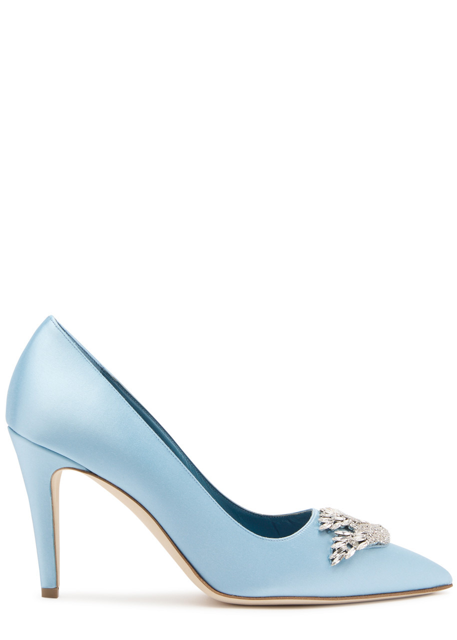 INFO & CARE - Handmade - Manolo Blahnik satin pumps - Heel measures approximately 3.5 inches/ 90mm - Crystal-embellished bird appliqué at pointed toe - Slip-on SIZE & FIT - Only available in full sizes, go up to the nearest whole size if you take a half size - Narrow across the toe